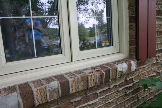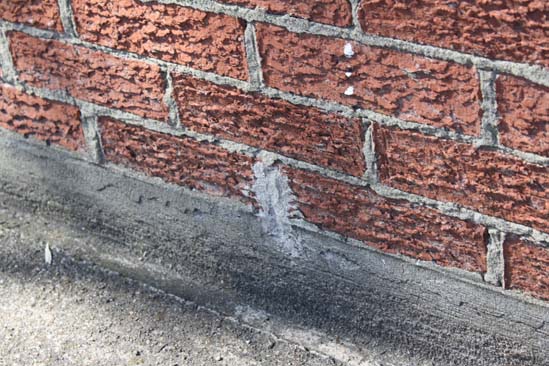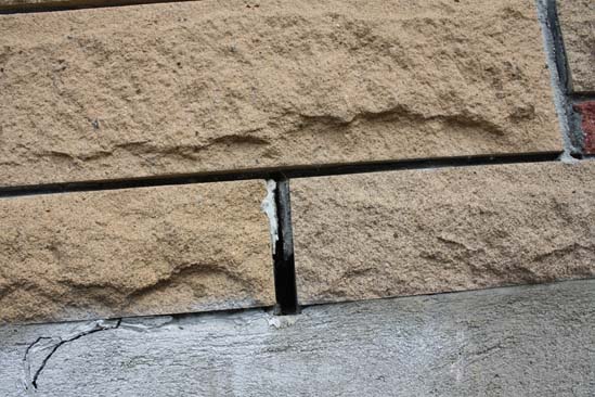 On peut voir un joint de mortier au centre qui a doublé de largeur (la section du bas est un chantepleure), dans la moitié du joint supérieure, on peut voir à droite, le mortier, au centre, un espace, et à gauche, un scellant. En bas à gauche : une fissure dans la fondation. On voit aussi une réparation du mortier du joint en haut à droite.