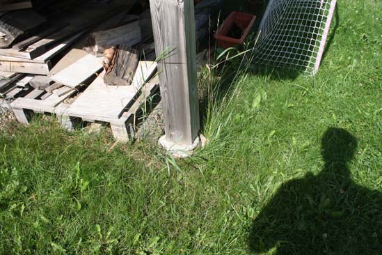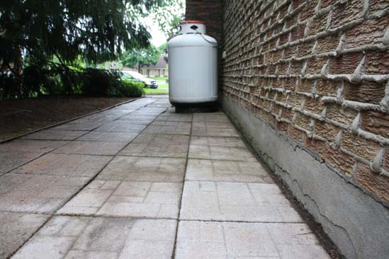 On peut voir une gouttière qui se jette prés des fondations